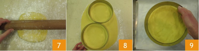 Transcurrido el tiempo de reposo, estirad la masa sobre la superficie ligeramente enharinada a ½ cm de espesor 7. Con un aro de repostería, obtened dos discos de 22 cm de diámetro 8 y transferid las formas a dos bandejas forradas con papel de horno 9.