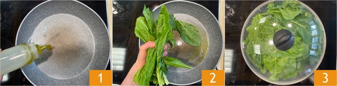 Para preparar la tarta pascualina fácil, empezad por las acelgas: calentad un chorrito de aceite en una sartén amplia antiadherente 1, añadid las acelgas 2 y cubrid con la tapa 3.