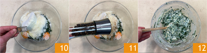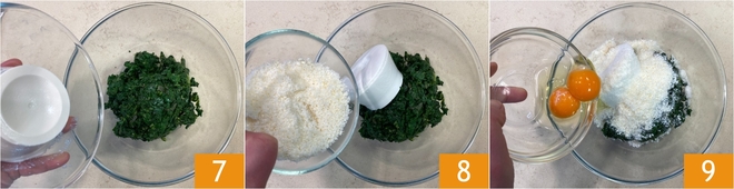 Para el relleno verde: pasad las acelgas picadas a un bol, luego añadid la ricotta 7, el queso rallado 8 y los huevos 9.