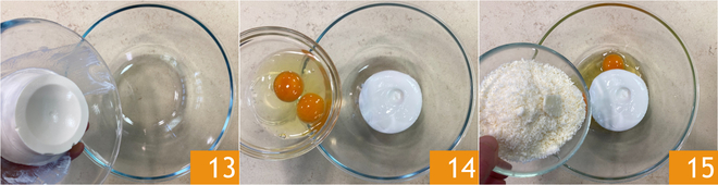 Pasad al relleno blanco: en otro bol verted la ricotta 13, los huevos 14 y el queso rallado 15.