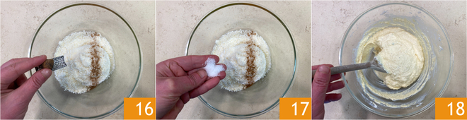 Añadid la nuez moscada 16, la sal 17 y la pimienta, y luego mezclad todo 18.