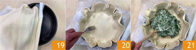 Estáis listos para montar la tarta: desenrollad la masa de hojaldre y colocadla con su papel de horno dentro de un molde de 20 cm de base y 24 cm en la superficie 19. Pinchad la base con un tenedor 20, luego repartid uniformemente el relleno verde 21.