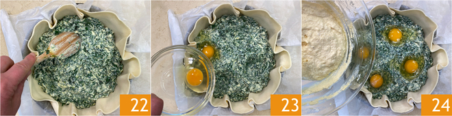 Con el reverso de una cuchara haced 4 huecos 22, luego verted un huevo entero en cada uno 23; para evitar que se rompan, os aconsejamos cascar los huevos aparte. Ahora añadid el relleno blanco 24.