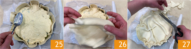 Alisad suavemente la crema 25, luego cubrid con el segundo rollo de masa de hojaldre 26 y recortad el exceso con unas tijeras 27.