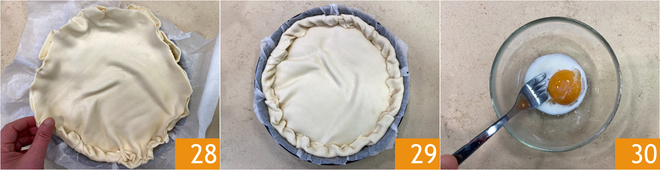 Sellad los bordes torciendo la masa sobre sí misma 28 29. En un cuenco pequeño, mezclad la yema con la leche 30.