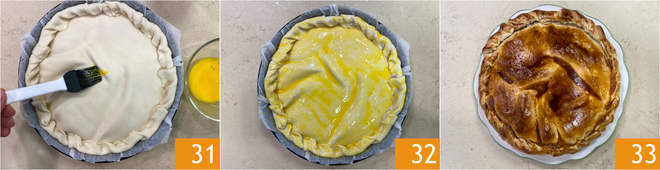 Pincelad la superficie y los bordes de la tarta con la mezcla obtenida 31. Hornead en horno estático precalentado a 200° durante unos 50 minutos. Una vez dorada, sacadla del horno y dejadla entibiar. ¡Vuestra tarta pascualina fácil está lista para servir 33!