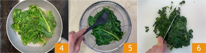 Cocinad a fuego medio durante unos 10-15 minutos, el tiempo justo para que se ablanden 4. Echad las acelgas en un colador y presionadlas bien para eliminar el exceso de agua 5; de este modo el hojaldre se mantendrá crujiente. Por último, picadlas finamente con el cuchillo 6.