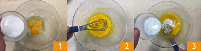 Para preparar la tarta rápida de Nutella, primero pon los huevos y el azúcar en un bol 1. Mezcla con un batidor de mano 2, luego agrega la leche en un hilo continuo, continuando mezclando 3.