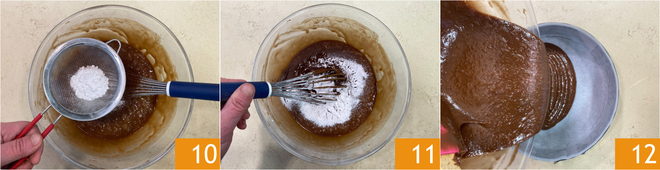 Finalmente tamiza la fécula de patata 10 y mezcla una última vez 11. Vierte la masa en un molde desmontable de 22 cm de diámetro, forrado con papel de horno 12.