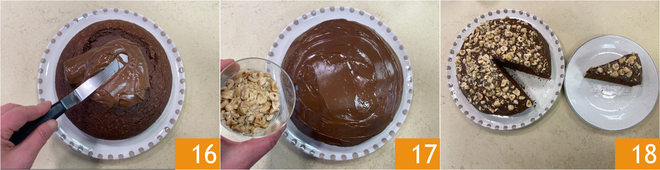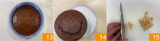 Nivela 13 y hornea en horno estático precalentado a 180° durante 50 minutos. Verifica la cocción con un palillo, luego saca del horno y deja enfriar antes de desmoldar la tarta sobre un plato de servir 14. Dedícate a la decoración: tritura groseramente las avellanas con un cuchillo 15.