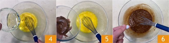 Haz lo mismo con el aceite de semillas 4. Añade la Nutella 5 y mezcla bien, luego agrega una pizca de sal 6.