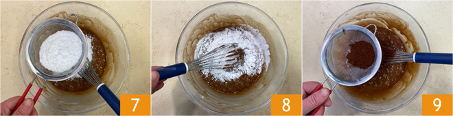 Tamiza la harina y la levadura directamente en el bol 7 y mezcla cuidadosamente para no formar grumos 8. Añade también el cacao amargo tamizado 9.