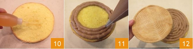 Vierte el almíbar en una botella de pastelería y utiliza aproximadamente la mitad para empapar la capa inferior del bizcocho 10. Si no posees una botella, puedes realizar esta operación con una cuchara. Cubre toda la superficie del bizcocho con la crema de chocolate ayudándote con una manga pastelera 11, reservando una pequeña cantidad para la decoración final. Coloca la capa de hojaldre ya fría sobre la crema pastelera de chocolate 12.