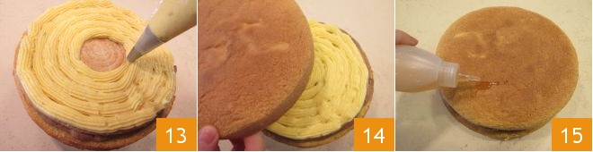 Cubre toda la superficie con la crema pastelera ayudándote con una manga pastelera 13, reservando un poco para rellenar los profiteroles y para la decoración final. Coloca el segundo disco de bizcocho 14, presionando ligeramente con las manos para asentar todo, y empapa la superficie con el almíbar restante 15. Luego coloca la tarta en el frigorífico.