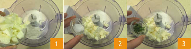 Para realizar la tarta salada con setas de chopo, lo primero es preparar la masa quebrada salada: en un procesador de alimentos con cuchillas de acero, verted la harina y la mantequilla fría de nevera 1, luego añadid la sal gruesa 2 y el tomillo 3.