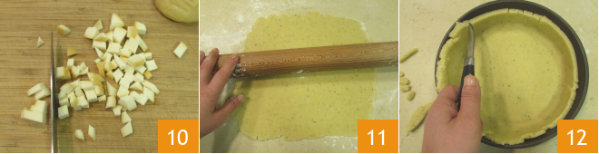 Cortad el queso ahumado en cubitos 10. Transcurrido el tiempo de reposo, extendé la masa sobre una superficie ligeramente enharinada hasta un grosor de 5-6 mm 11 y forrad un molde de 20 cm de diámetro en la base y 22 cm en la superficie, retirando con un cuchillo la masa sobrante 12.