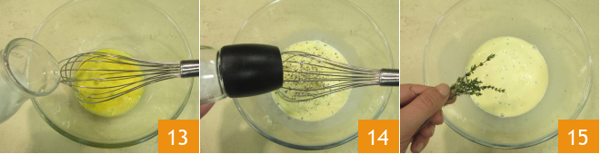 Pasad al relleno: batid los huevos en un bol, luego añadid la nata 13, la sal 14, la pimienta y el tomillo 15.