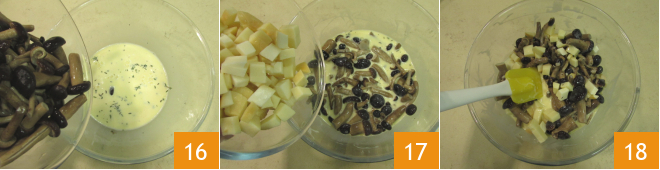 Añadid también las setas 16 y los cubitos de queso ahumado 17, luego mezclad bien para amalgamar todo 18.