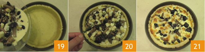 Verted la mezcla obtenida en el molde 19, aromatizad con unas hojitas de tomillo 20 y hornead en horno estático precalentado a 200° durante 30 minutos, después bajad la temperatura a 180° y hornead durante otros 10 minutos. ¡Vuestra tarta salada con setas de chopo está lista para ser disfrutada 21!