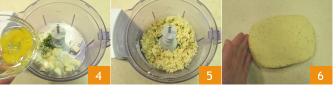 Añadid también el huevo 4 y triturad hasta obtener una mezcla arenosa 5. Trasladad la mezcla a una superficie de trabajo y trabajad rápidamente con las manos para formar un bollo 6. Envolved el bollo en film transparente y dejad reposar en el frigorífico durante al menos una hora.