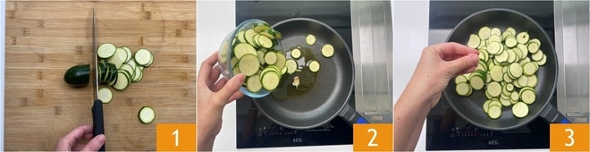 Para preparar la tarta salada de calabacines y ricotta, lo primero que hay que hacer es lavar y cortar los calabacines en rodajas bastante finas 1. Intentad obtener un grosor de 2-3 mm. En una sartén, echad un hilo de aceite y añadid un diente de ajo aplastado con su piel. Dejad que se infusione durante unos minutos, luego añadid los calabacines 2. Usad una sartén grande para que la mayoría de los calabacines no se superpongan. Añadid sal 3 y cocinad a fuego medio.