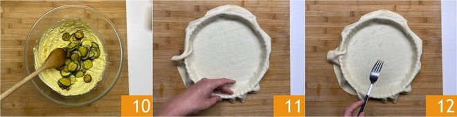 Mezclad con una cuchara de madera 10. Tomad el hojaldre y desenrolladlo con cuidado. Colocadlo en un molde, preferiblemente con fondo desmontable, de 24 cm de diámetro. Haced que los bordes se adhieran con cuidado, dejando que el exceso quede por fuera 11. Pinchad el fondo con las púas de un tenedor 12.