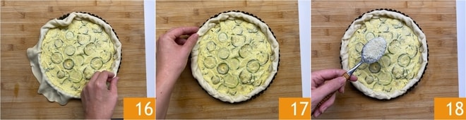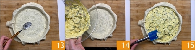 Esparcid la base con el Grana rallado reservado 13, esto servirá para aislar la base y evitar que se humedezca durante la cocción. Ahora verted el relleno 14 y nivelad con la espátula 15.