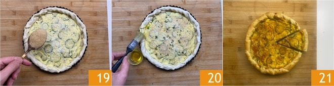 Espolvoread también con una ligera capa de pan rallado 19 para obtener un dorado perfecto, y más tomillo. Echad una abundante cucharada de aceite en un bol pequeño y mojéis el pincel. Pincelad así todo el borde 20. Rociad con el poco aceite residual (en el pincel y en el bol) también el resto de la tarta. Cocinadla en el horno estático a 200° durante 35-40 minutos. Desmoldadla con cuidado después de dejar que se temple y servidla 21.