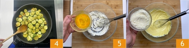 Cocinad durante 8-10 minutos, sin remover demasiado, hasta obtener unos calabacines tiernos pero ligeramente dorados 4. Quitad el ajo, reservad y dejad que se templen. Mientras tanto, trabajad la ricotta en un bol, utilizando un batidor de mano. Añadid los huevos 5 y el Grana Padano rallado, reservando un poco 6.