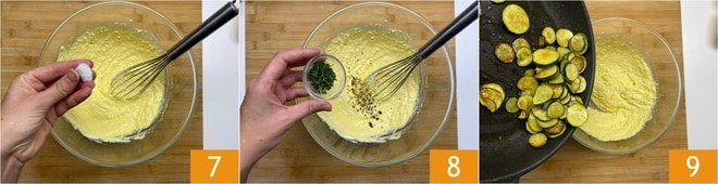 Incorporad una pizca de sal 7, una pizca de pimienta y el tomillo 8. Mezclad bien con el batidor, luego añadid los calabacines ya templados 9.