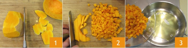 Para preparar la tarta salada de calabaza, primero quitad la piel de la calabaza con un cuchillo 1, luego cortad la pulpa en cubos de unos 2 cm 2: en total necesitaréis aproximadamente 465 g de calabaza limpia. Calentad el aceite en una sartén y añadid la calabaza en cubos 3.