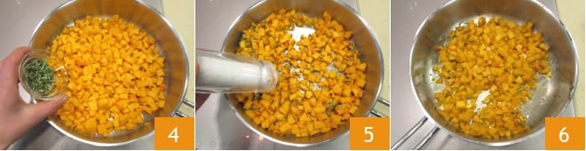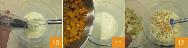 Salpimentad 9, luego agregad la calabaza templada 11 y la scamorza 12 y mezclad bien para integrar todo.
