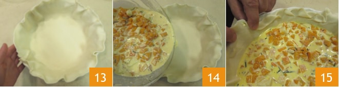 Desenrollad el hojaldre y colocadlo en un molde con un diámetro de 22 cm en la base y 26 cm en la superficie 13. Verted dentro la mezcla obtenida 14 y doblad el borde del hojaldre para crear un motivo decorativo 15.