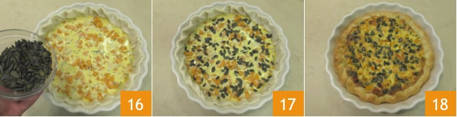Por último, distribuid las semillas de calabaza en la superficie 16, luego hornead en horno estático precalentado a 180° durante unos 60 minutos, colocándola en la rejilla de abajo 17. Una vez cocida, dejad reposar vuestra tarta salada de calabaza durante 10-15 minutos antes de servirla 18!