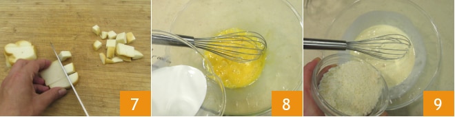 Mientras tanto, cortad la scamorza en cubos 7. Ahora batid los huevos en un bol, añadid la nata 8 y el Grana rallado 9.