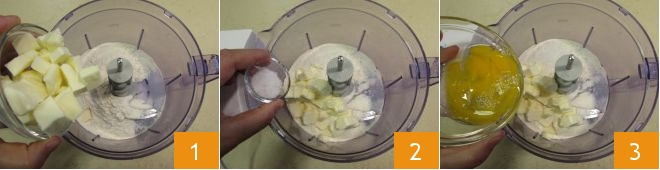 Para preparar la tarta salada de higos empezad por la Pasta quebrada salada: echad en el robot la harina, la mantequilla fría del frigorífico 1, la sal gorda 2 y por último el huevo 3.