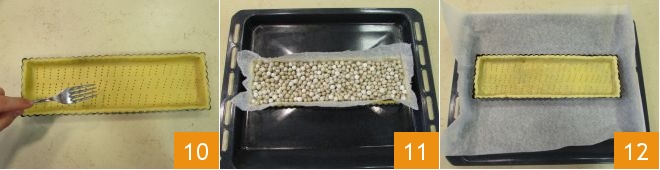 Pinchad la base con los dientes de un tenedor 10 y cubridla con una hoja de papel de horno arrugada. Rellenad el molde con bolitas de cerámica o legumbres secas y proceded al horneado a ciegas: hornead en horno estático precalentado a 200° durante 15 minutos 11, después retirad tanto el papel como las bolitas y hornead otros 10 minutos más 2-3 minutos adicionales en función grill 12.
