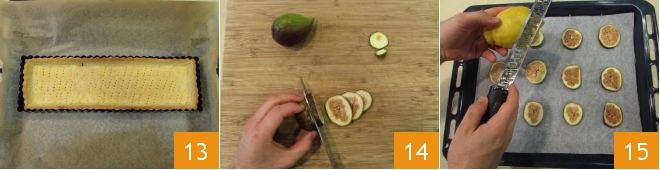 De este modo la base de la tarta salada quedará dorada de forma uniforme y cocida por dentro 13. Dejadla enfriar y ocupaos de los higos caramelizados. Tras lavarlos y secarlos, cortadlos en rodajas de unos 7-8 mm de grosor 14. Colocad las rodajas de higo en una bandeja con papel de horno y aromatizad con la ralladura de medio limón 15.