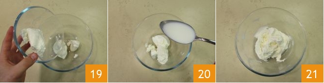 Ahora preparad la crema: en un bol unid el queso crema para untar y la robiola 19, aligerad con una cucharada de leche 20 y mezclad hasta obtener una mezcla homogénea 21.