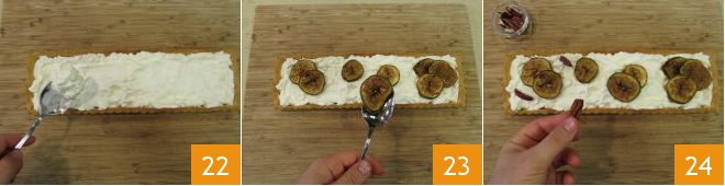 Rellenad la tarta ya fría con la crema de queso, cuidando de distribuirla a cucharadas irregulares para darle un poco de movimiento 22. Decorad con los higos, superponiendo alguna rodaja 23, añadid las nueces pecanas, algunas enteras y otras troceadas 24,