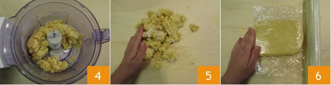 Poned en marcha el robot para compactar todo 4, luego trasladad la masa a la superficie de trabajo 5 y formad un bloque. Envolvedlo en film transparente y dejadlo en la nevera al menos una hora 6.