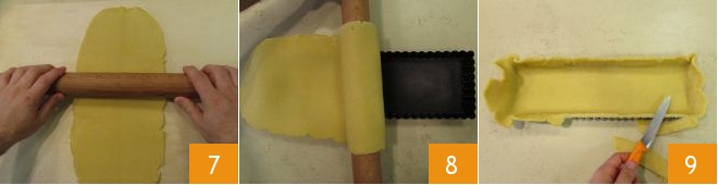 Transcurrido el tiempo de reposo, retomad la masa y estiradla sobre una superficie ligeramente enharinada con el rodillo 7 hasta formar un rectángulo de un grosor de aproximadamente 0,5 cm. Forrad un molde rectangular de 35x11 cm envolviendo y desenrollando la masa directamente en el molde 8. Asegurad bien la masa salada y luego recortad el exceso con un cuchillito 9.