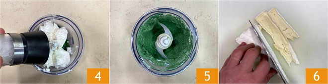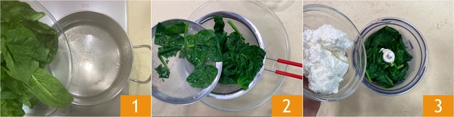 Para preparar la tarta salada de Navidad, lo primero que debes hacer es escaldar las espinacas 1, escúrrelas 2 bien y luego colócalas en un procesador de alimentos y añade la ricotta 3.