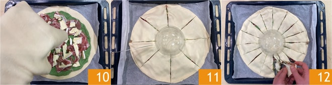 Cubre con el segundo rollo de hojaldre 10 y marca el centro con un cuenco pequeño. Corta 4 porciones, siguiendo una cruz imaginaria, luego divídelas a la mitad para obtener 8 11, divide nuevamente a la mitad para obtener 16. Toma dos porciones y enróllalas dos veces hacia afuera 12.