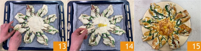 Une los extremos y sujétalos con un palillo 13. Repite el mismo procedimiento hasta obtener 8 puntas. Coloca un vaso en el centro, sin presionar demasiado, y haz un diseño a placer dentro del círculo. Pinta con la yema de huevo 14 y deja reposar en el frigorífico durante 30 minutos o durante 10 minutos en el congelador. Hornea en el horno precalentado, función estática, en la rejilla del medio, a 190°C durante unos 25 minutos. Tu tarta salada de Navidad está lista para ser servida 15.