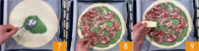 Coloca un rollo de hojaldre, con su papel de horno, en una bandeja. Pon en el centro la crema de ricotta y espinacas 7 y extiéndela sobre la superficie dejando 1,5 cm de borde. Coloca encima del relleno el beicon 8 y el brie 9.
