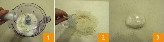 Para preparar la tarta salada de setas y lentejas, comienza con la base de Pasta brisa. En el procesador mezcla la harina, la mantequilla fría en trozos, una pizca de sal 1 y procesa todo hasta obtener una mezcla arenosa. Transfiere la masa harinosa a una superficie de trabajo y amasa brevemente, añadiendo poco a poco el agua fría 2. Trabaja lo menos posible, para no derretir la mantequilla, hasta obtener una masa compacta y elástica. Envuelve el bloque de masa con film transparente y deja reposar en el frigorífico por al menos 40 minutos 3.