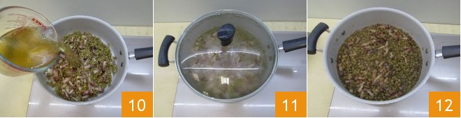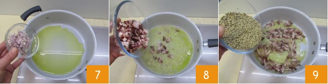 En una sartén grande, vierte un poco de aceite y cocina a fuego muy bajo el chalote 7, dejándolo sudar durante 7-8 minutos, recuerda remover de vez en cuando. Luego añade también el bacon y cocina por 3-4 minutos 8. Cuando el fondo esté bien cocido, puedes añadir las lentejas secas 9