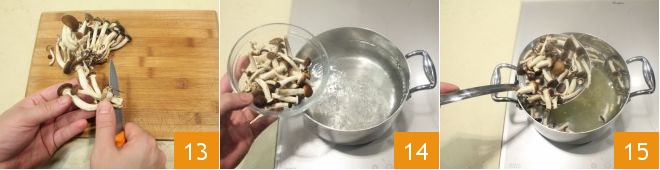 Limpia las setas chiodini eliminando posibles restos de tierra 13 y luego escáldalas en agua hirviendo durante 15 minutos 14, finalmente escúrrelas bien 15.