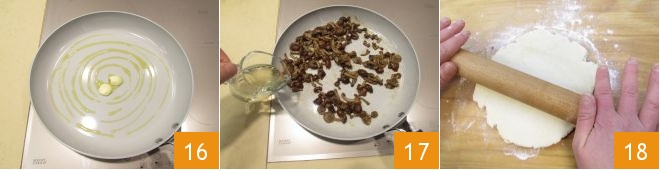 Mientras tanto, deja que el ajo se sazone en una sartén con un poco de aceite 16, luego elimínalo y saltea las setas durante 2-3 minutos, después de lo cual añade el vino blanco 17 y, en cuanto se evapore, apaga el fuego y deja enfriar completamente. Recupera la brisé y extiende la masa sobre una superficie ligeramente enharinada a un espesor de aproximadamente 0,5 cm 18,